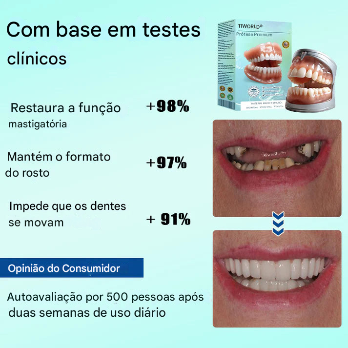 "Não consigo acreditar na transformação! Antes de usar a prótese dentária Tiworld® Premium, eu tinha vergonha de sorrir ou falar abertamente. Meus dentes estavam manchados, desalinhados e me deixavam insegura. Mas agora, me sinto uma nova pessoa! A prótese se encaixa perfeitamente, parece natural e me dá a confiança para sorrir abertamente."